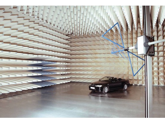 AVTC是按照CISPR 12/25和ISO 11451-2/11452-2對汽車整車和零部件進行輻射發射和輻射抗擾度測試的標準暗室。暗室的標準尺寸可容納長達5.5米的被測車輛(在轉臺上),測量距離為3米。若添加地面吸波材料(可選配置),就可以按照EN 55022(CISPR 16-1-4)和IEC/EN 61000-4-3分別做輻射發射和輻射抗擾度測試。
