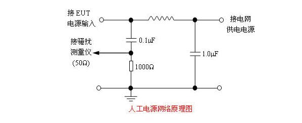 用人工電源網絡的目的,是將該網絡接入接收機電源插頭與供電電源之間,使接收機電源兩端之間,有一特定的高頻阻抗,同時隔離供電電源,以便使用非平衡輸入干擾測量儀,測量對稱干擾電壓和非對稱干擾電壓。該網絡還應包括濾波器部分,用來濾除供電系統中存在的射頻干擾。必要時,還應加輔助濾波器,在所測頻率范圍內,濾波器的阻抗要足夠高,使其不影響網絡的阻抗特性。要求電源AB兩端之間的阻抗以及AB兩端連在一起對地的阻抗為150±20Ω,其相位角不超過±20°。