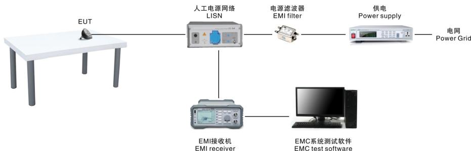 電源線傳導騷擾的測試,盡管不同產品由不同標準進行進行規定,但基本方法是一樣的,由人工電源網絡(AMN或稱線路阻抗穩定網絡LISN)和EMI測試接收機組成,其中人工電源網絡可以在給定頻率范圍內,為騷擾電壓的測量提供標準規定的50歐姆阻抗,并使受試設備(EUT)與電源相互隔離。