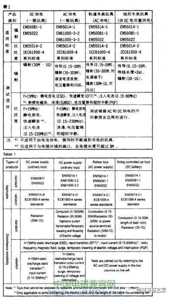 表1不包括以無線電發射接收為主要功能的玩具(如遙控車、對講機等).歐洲對該類產品有專用標準要求,在此就不另行介紹。