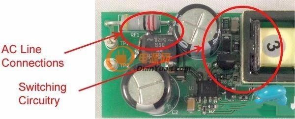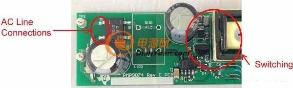 圖1是這些非計劃中電容的一個實例。圖中的右側是一個垂直安裝的FET,所帶的開關節點與鉗位電路延伸至了圖片的頂部。輸入連接從左側進入,到達距漏極連接1cm以內的位置。這就是故障點,在這里FET的開關電壓波形可以繞過EMI濾波器耦合至輸入。