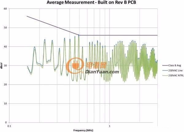 圖4是修改后的效果圖。我們在故障點位置為EMI規范獲得了大約6dB的裕量。此外,我們還顯著減少了總體EMI簽名。所有這些改善都僅僅是因為布局的調整,并未改變電路。如果您的電路具有高電壓開關并使用了屏蔽距離,您需要非常小心地對其進行控制。
