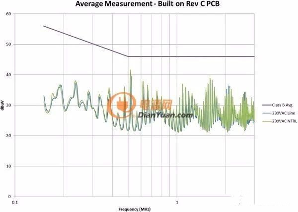 注意,漏極連接與輸入引線之間有一些由輸入電容器提供的屏蔽。該電容器的外殼連接至主接地,可為共模電流提供返回主接地的路徑。如圖2所示,這個微小的電容會導致電源EMI簽名超出規范要求。