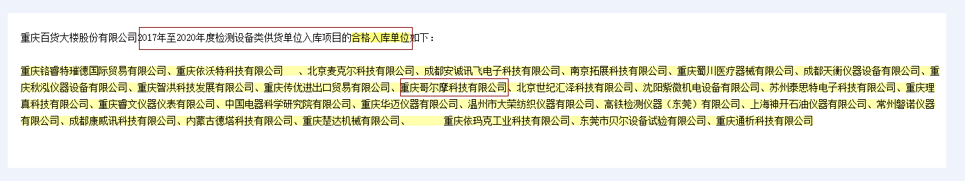 賀我公司成為重慶百貨大樓股份有限公司2017年至2020年度檢測設備類供貨單位