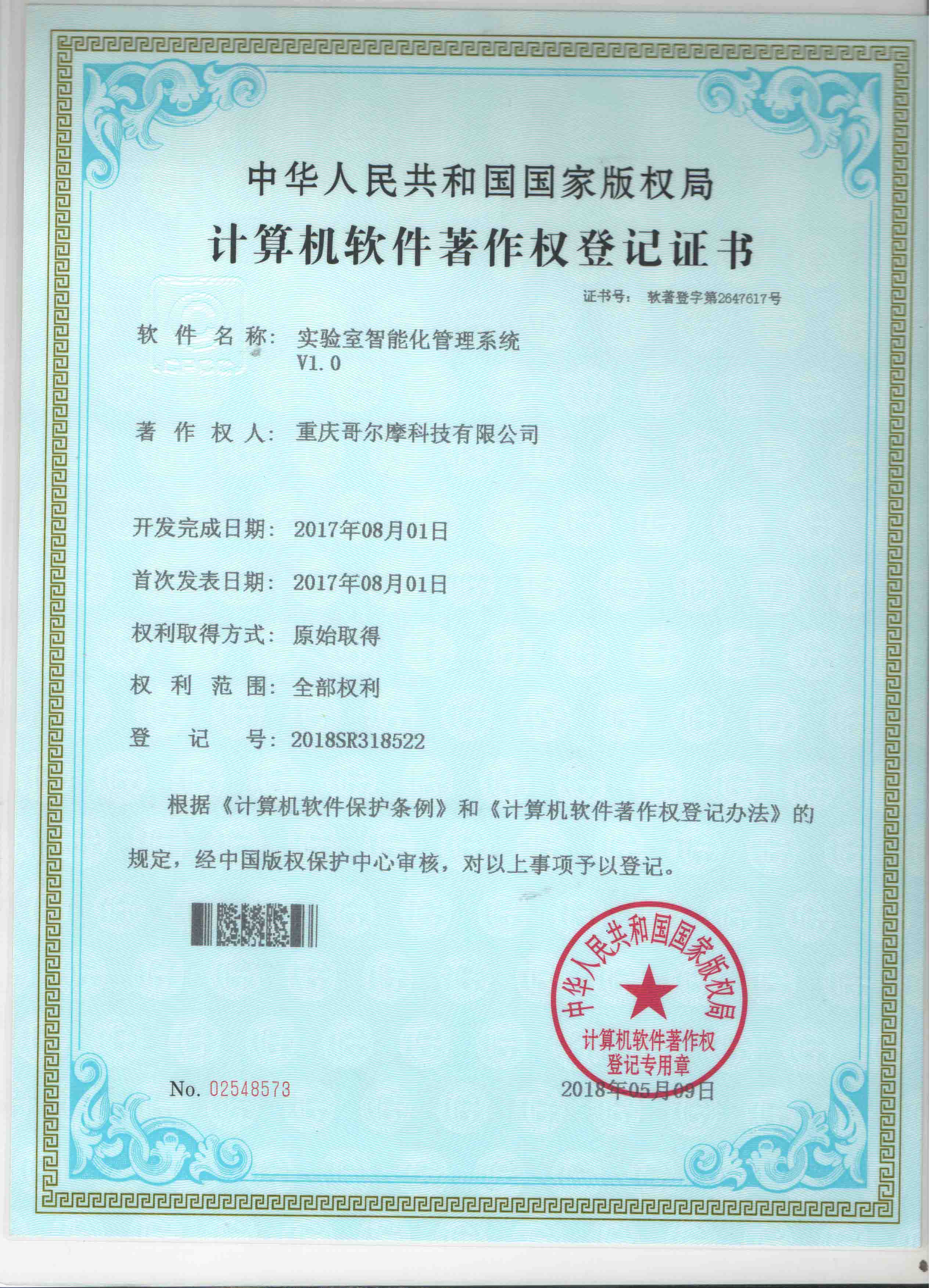 近日,公司已通過中華人民共和國國家版權局的審批,2018年5月9日獲得中華人民共和國國家版權局頒發的計算機軟件著作權登記證書。重慶哥爾摩科技有限公司將不斷進行電磁兼容領域的技術創新和改革,進一步提高行業的核心競爭力,也為公司的發展提供了強有力的科技支撐。