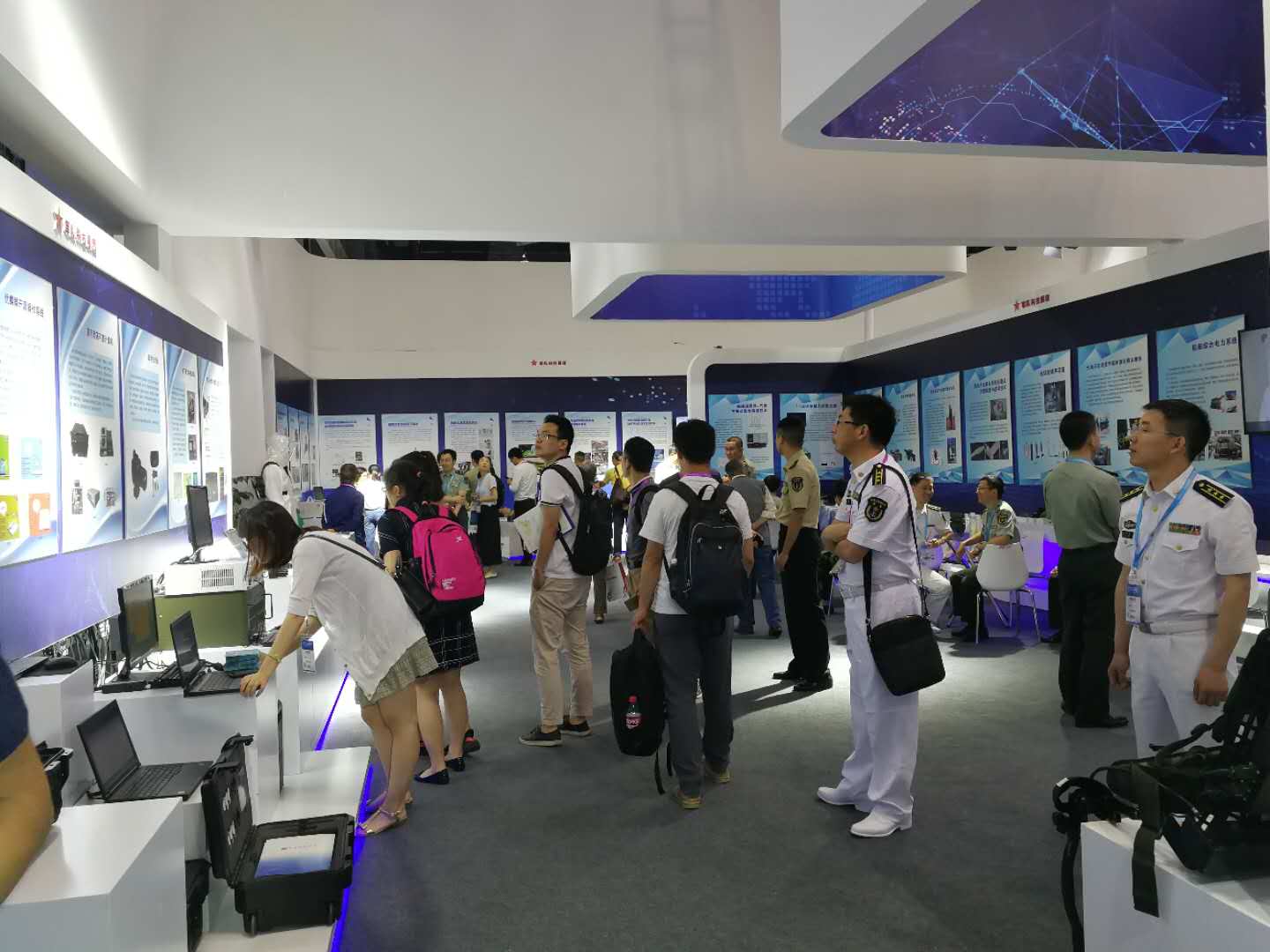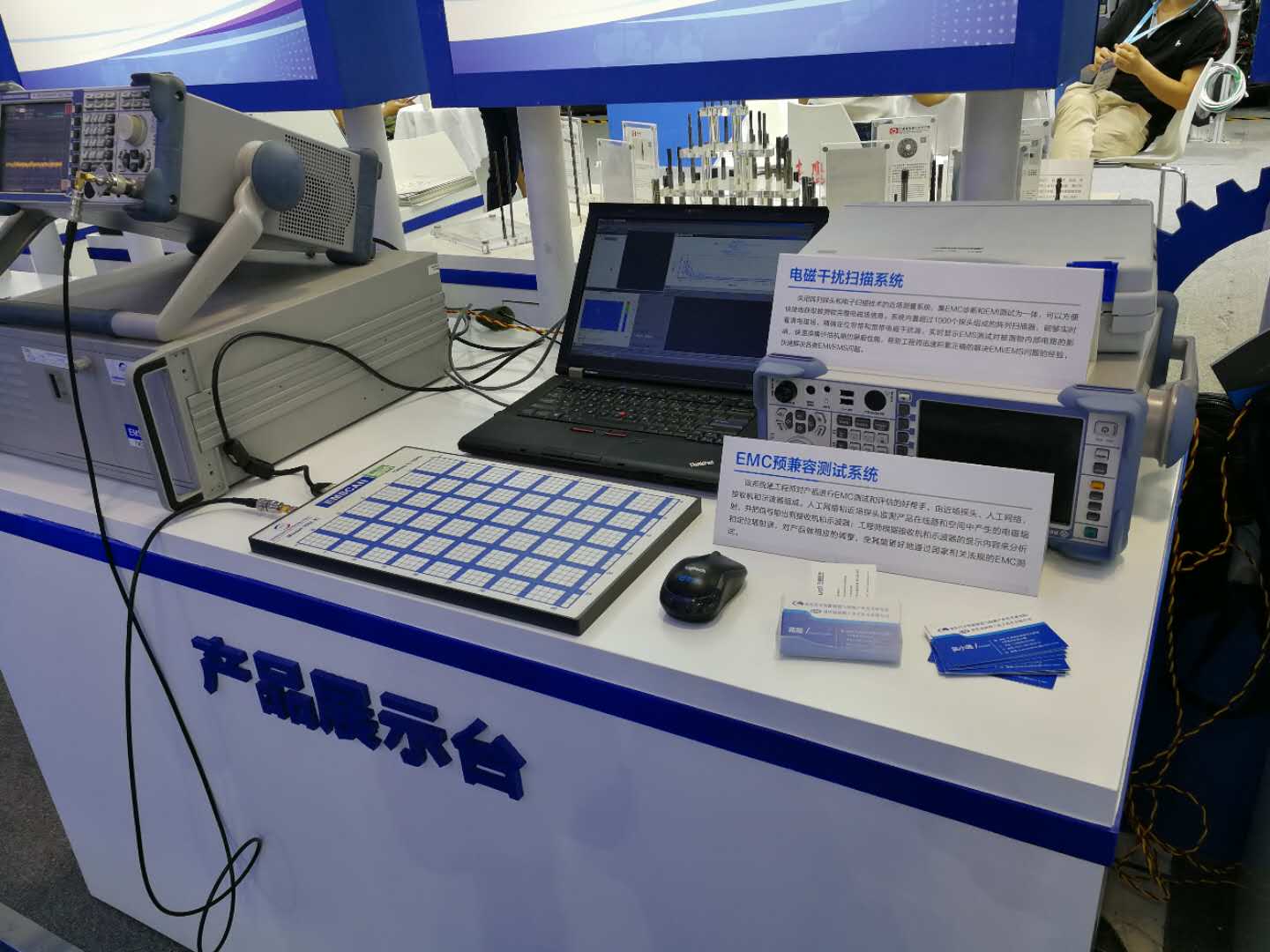會場一號廳主要是中國海陸空的兵甲裝備展示,其中包括無人機,無人直升機,無人駕駛智能車,安防裝備,船舶重工等,會場二號廳則是重慶各大地區和重慶各個高校的高新技術成果展,其中在重慶理工大學展臺,向我們展示了EMC預兼容測試系統和電磁干擾掃描系統設備,李旭博士還給我們演示了EMC預兼容測試系統的操作,讓我們對EMC測試系統設備有了更進一步的認識。