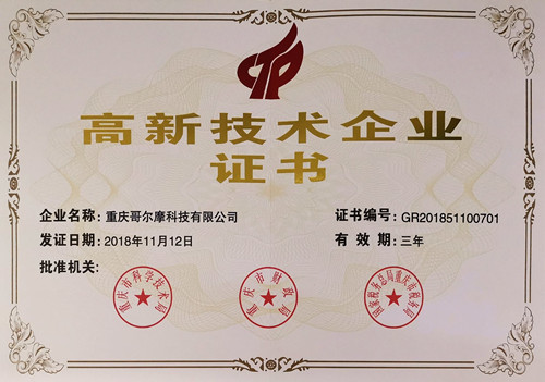 喜訊熱烈祝賀重慶哥爾摩科技有限公司榮獲“高新技術企業證書”