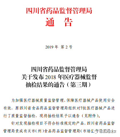 | 四川省藥品監督管理局關于發布2018年醫療器械監督抽檢結果的通告(第三期) |