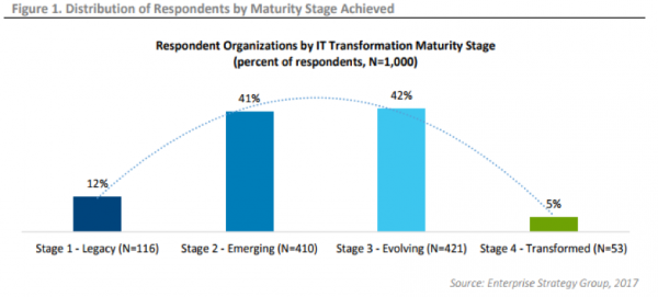 一個郵箱升級案例,折射出企業數字化轉型的復雜度。這也就難怪,在ESG企業戰略集團2017年4月發布的報告顯示,調查了全球1000家企業,發現轉型得比較成功的企業(階段4)只有5%。多數企業處于第二、第三階段。