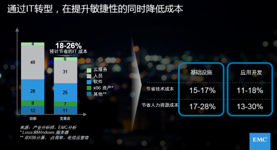 EMC公司自己的IT,也率先邁向轉型之路,為幫助客戶轉型積累經驗。例如,下面這些數據就來自EMC自身IT轉型的總結。