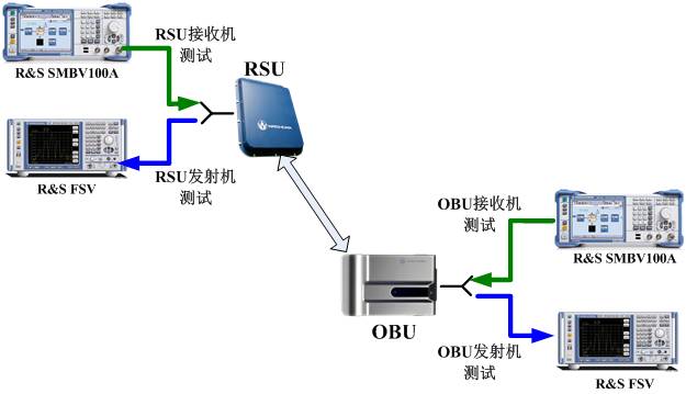 依據GB/T 20851.5-2007標準,主要是針對RSU和OBU物理層參數的測試,包括 RSU發射機測試,RSU接收機測試,OBU 發射機測試和 OBU 接收機測試共4 類。其測試框圖如下: