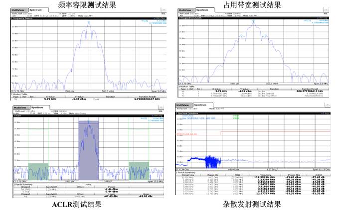 射頻測試主要包括:頻率、頻率容限、占用帶寬、鄰道功率及雜散發射等指標,可以采用FSV的基本射頻功能完成測試,其測試結果如下: