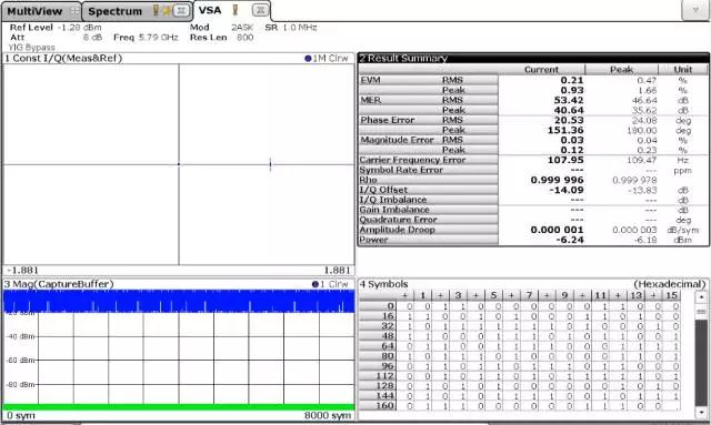 在數據率不大的情況下,采用ASK調制方式可以滿足通信傳輸的需要。且信號占用帶寬小,調制和解調的電路比較簡單,容易實現。可以采用FSV-K70VSA任意矢量分析軟件,對ASK信號進行解調,同時可以得到調制系數和調制速率的測試結果,如下: